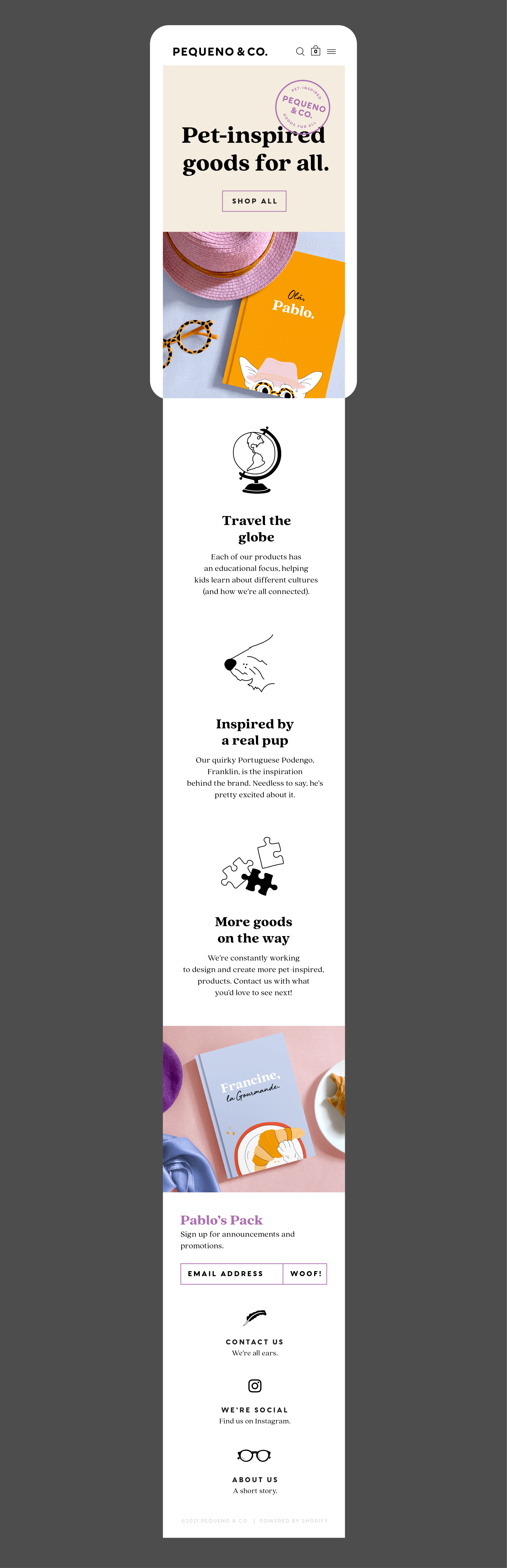 I created and launched Pequeno & Co. as a creative outlet — I author and illustrate children’s books under this brand. Pablo, one of the main characters in the books, is inspired by my real pup, Franklin. The stories are meant to be educational, playful, and visually beautiful, with a recurring theme of how cultures are unique, yet we’re all connected.